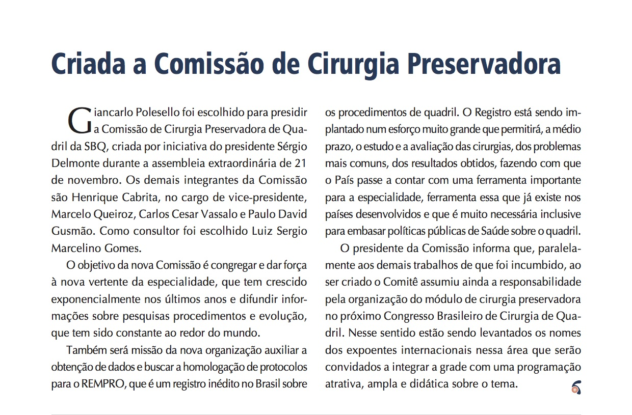 O presidente da Comissão informa que, paralela- mente aos demais trabalhos de que foi incumbido, ao ser criado o Comitê assumiu ainda a responsabilidade pela organização do módulo de cirurgia preservadora no próximo Congresso Brasileiro de Cirurgia de Qua- dril. Nesse sentido estão sendo levantados os nomes dos expoentes internacionais nessa área que serão convidados a integrar a grade com uma programação atrativa, ampla e didática sobre o tema.