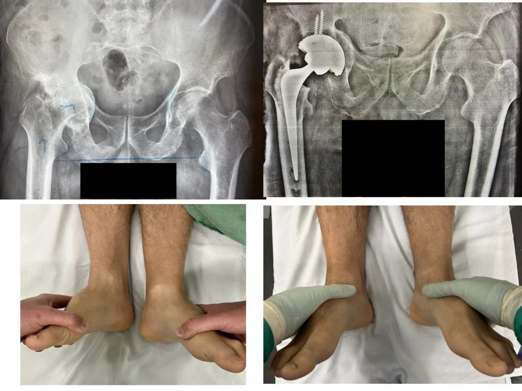 Correção da diferença de comprimento devido à artrose severa do quadril direito com uso de enxerto, parafusos e implante especial no acetábulo.